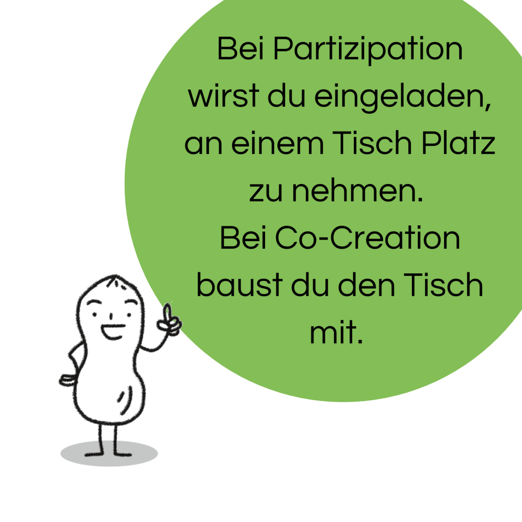 🥜 Bei Partizipation wirst du eingeladen, an einem Tisch Platz zu nehmen. Bei Co-Creation baust du den Tisch mit.
